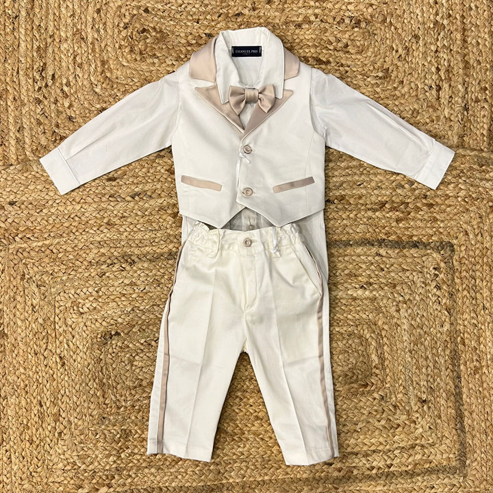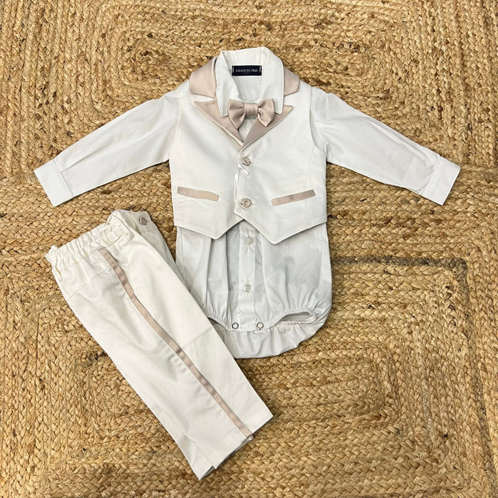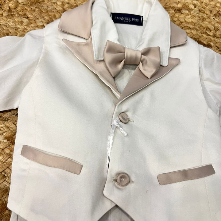 Il completo elegante della prestigiosa azienda italiana è l'ideale per le occasioni speciali. Realizzato in un elegante color off white, comprende un panciotto e un pantalone con rifiniture in raso, un papillon coordinato e una camicia a body per un look impeccabile. Aggiungi un tocco di classe al tuo guardaroba con questo completo elegante.