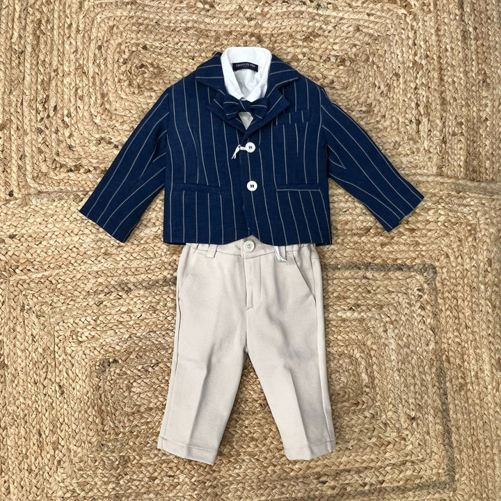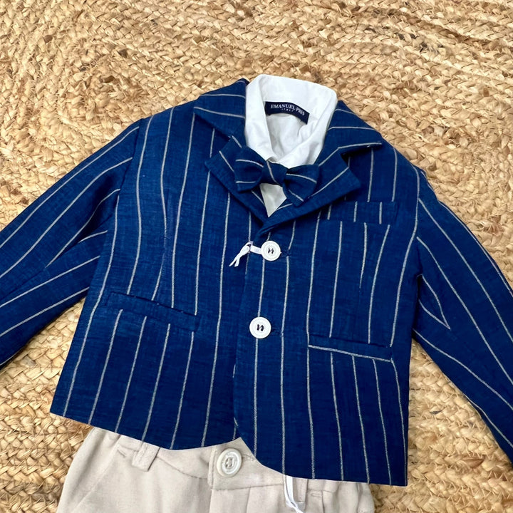 Scopri il completo elegante dell'azienda italiana perfetto per il battesimo e il primo compleanno. Con pantalone punto milano, giacca riga uguale papillon e camicia body in cotone, non solo avrai un look elegante ma anche comodo e adatto per ogni occasione speciale.