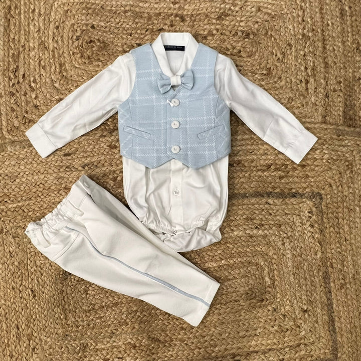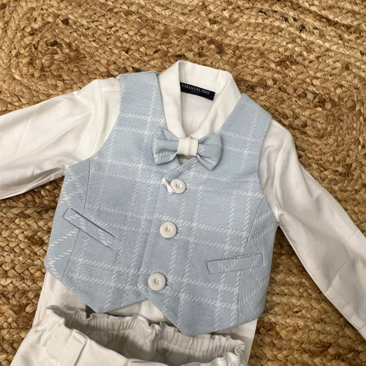 Scopri il completo elegante dell'azienda italiana perfetto per il battesimo e il primo compleanno. Con pantalone punto milano, gilet quadri uguale papillon e camicia body in cotone, non solo avrai un look elegante ma anche comodo e adatto per ogni occasione speciale.