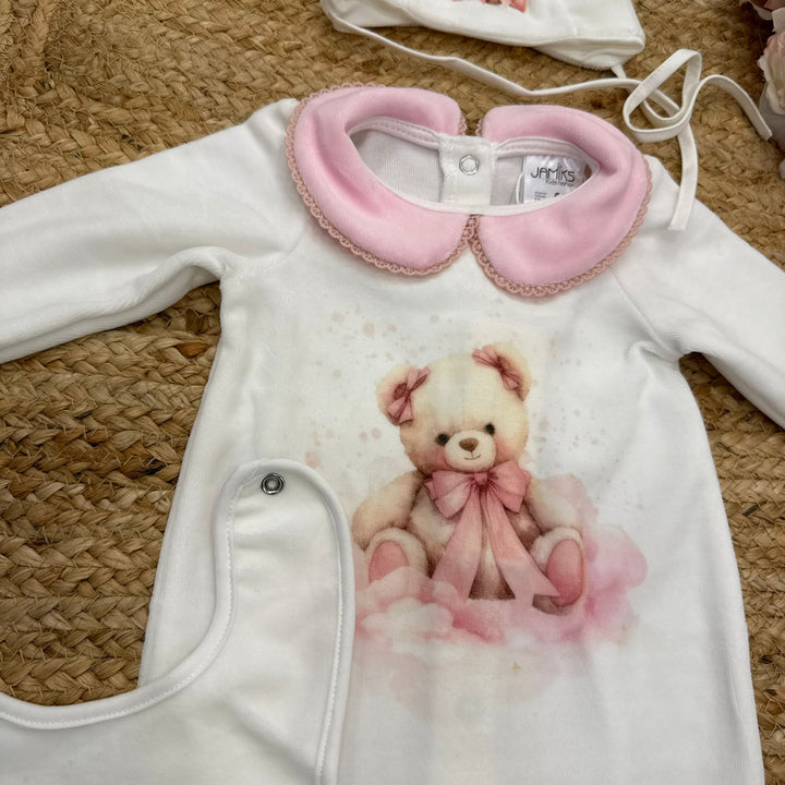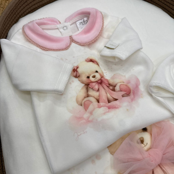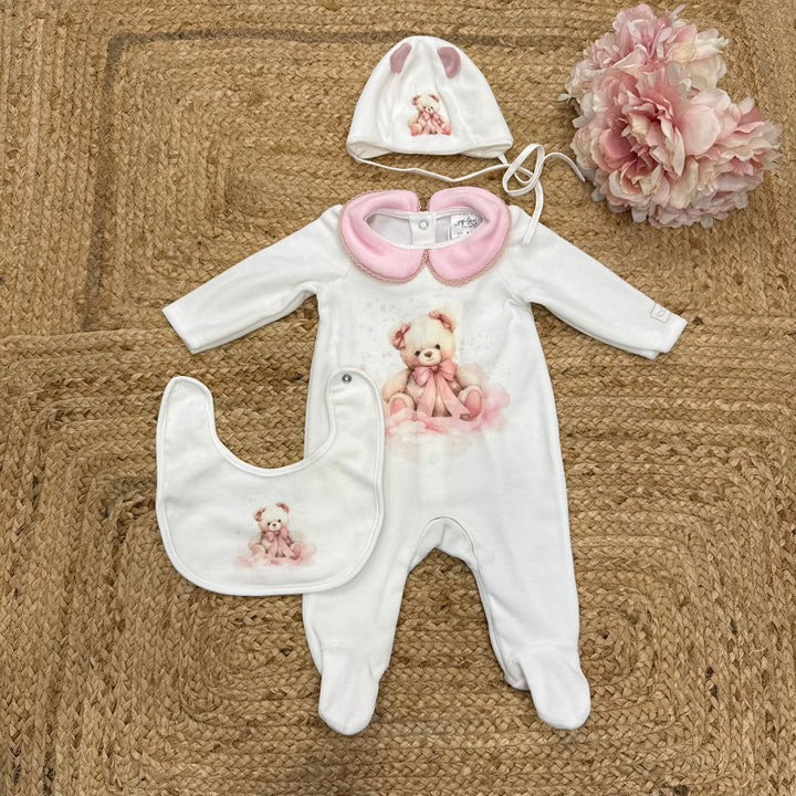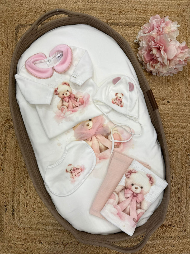 Il set include tutina, berrettino, scarpine, copertina e bavetta.