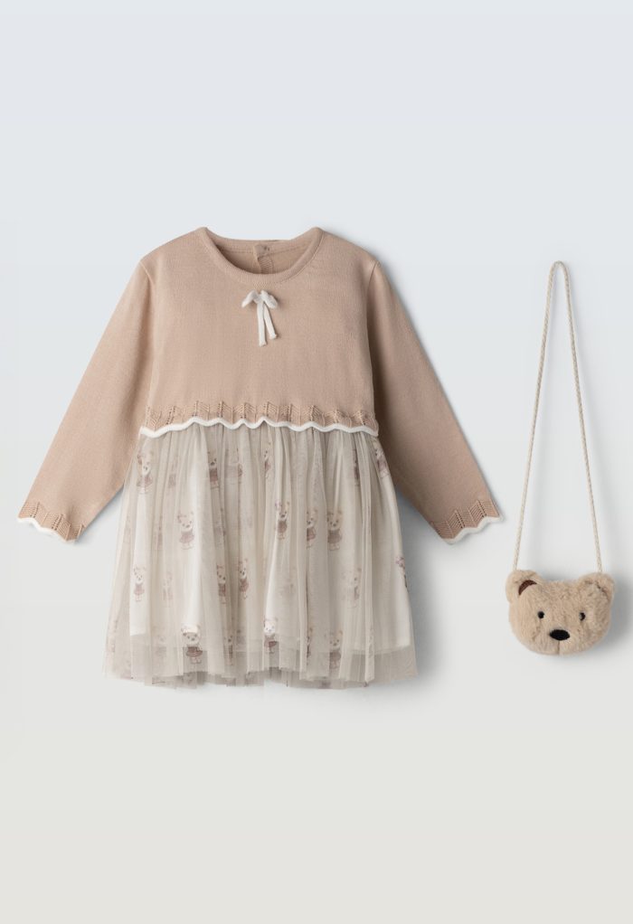 Questo abitino elegante per neonata unisce raffinatezza e comfort, realizzato con tulle stampato delicato che conferisce un tocco di leggerezza e stile. Completo di una borsetta in maglia coordinata, è perfetto per occasioni speciali, offrendo praticità senza rinunciare all’eleganza. Ideale per vestire con cura la tua piccola nelle cerimonie più importanti.
