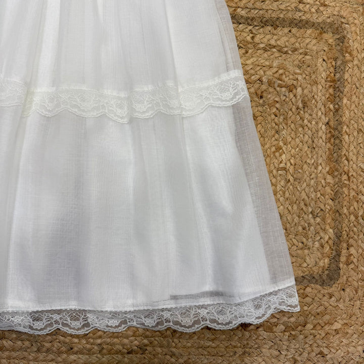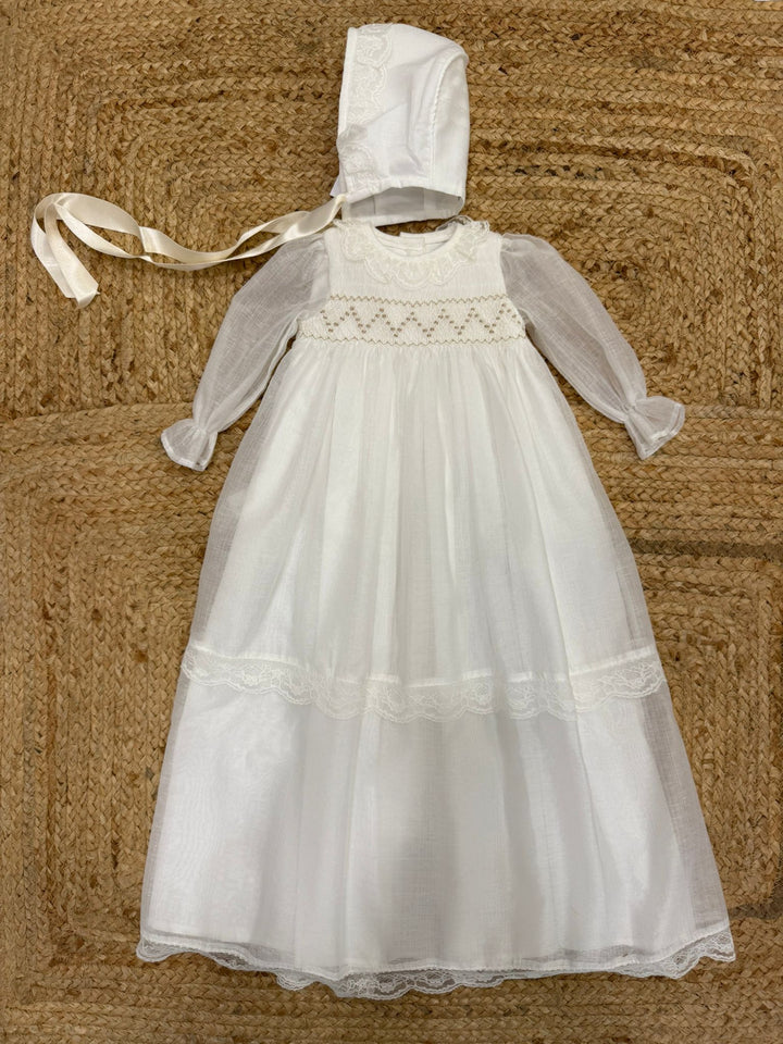 Questo abito battesimale dallo stile spagnolo unisce eleganza e raffinatezza, ideale per celebrare momenti speciali. Presenta un delicato punto smoke frontale che dona un tocco unico, impreziosito da ricami finemente lavorati sul colletto e in punti selezionati del tessuto. Il fiocco in raso sul retro completa l’insieme con classe, mentre la cuffia abbinata rende il completo perfetto per un’occasione solenne come il battesimo. Un capo che coniuga tradizione e cura sartoriale per un look impeccabile.