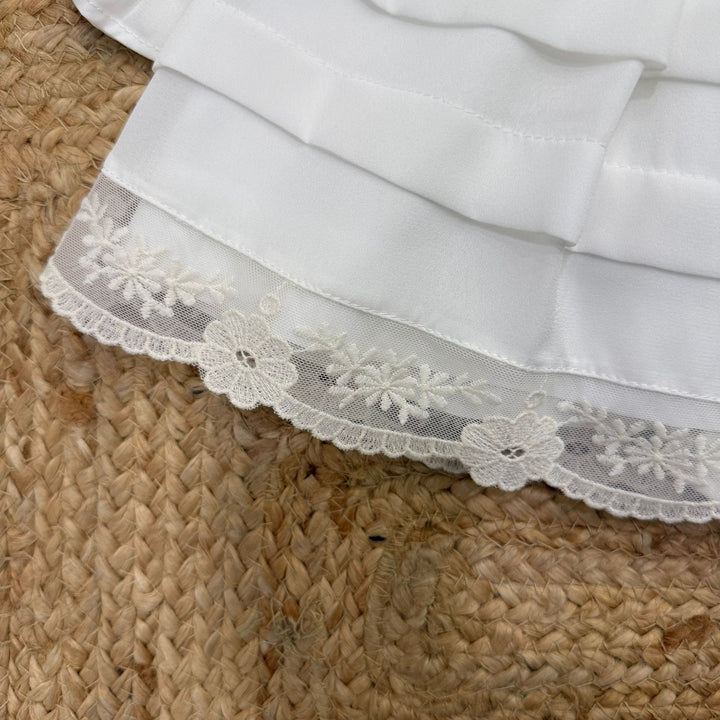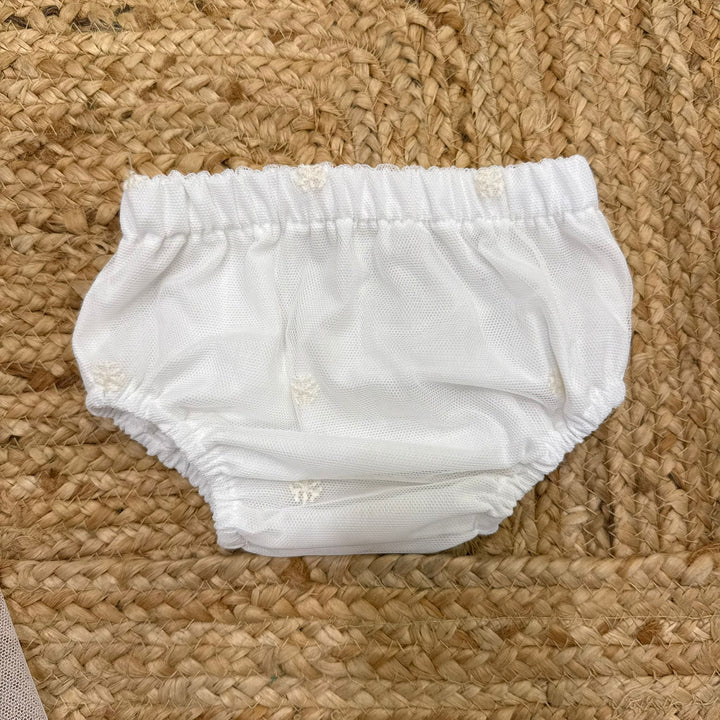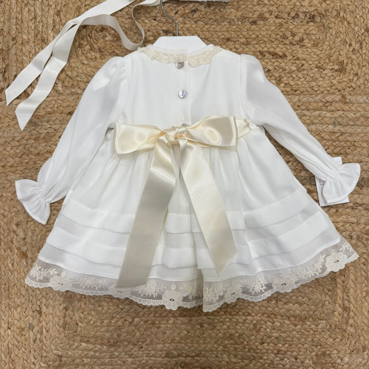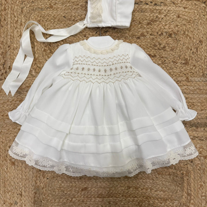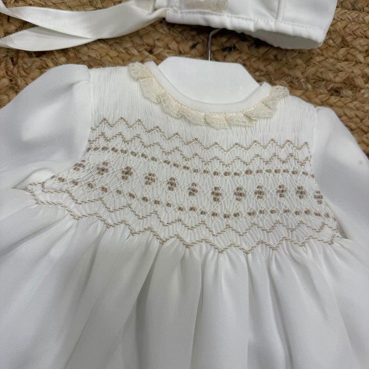 Questo abito elegante per battesimo combina raffinatezza e stile classico. Presenta un delicato punto smok sul davanti e maniche velate che donano leggerezza e grazia. La parte bassa è impreziosita da un elegante pizzo, mentre un fiocco sul retro aggiunge un dettaglio sofisticato. Completo di cuffia e culotte coordinata, è la scelta perfetta per un’occasione speciale all’insegna dell’eleganza senza tempo.