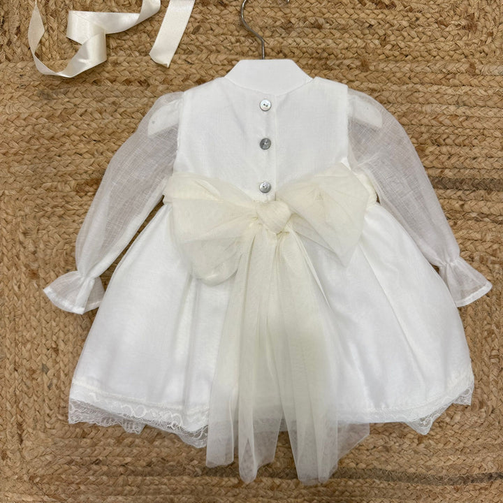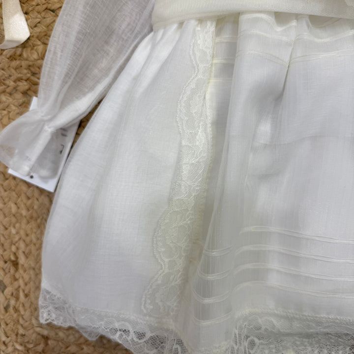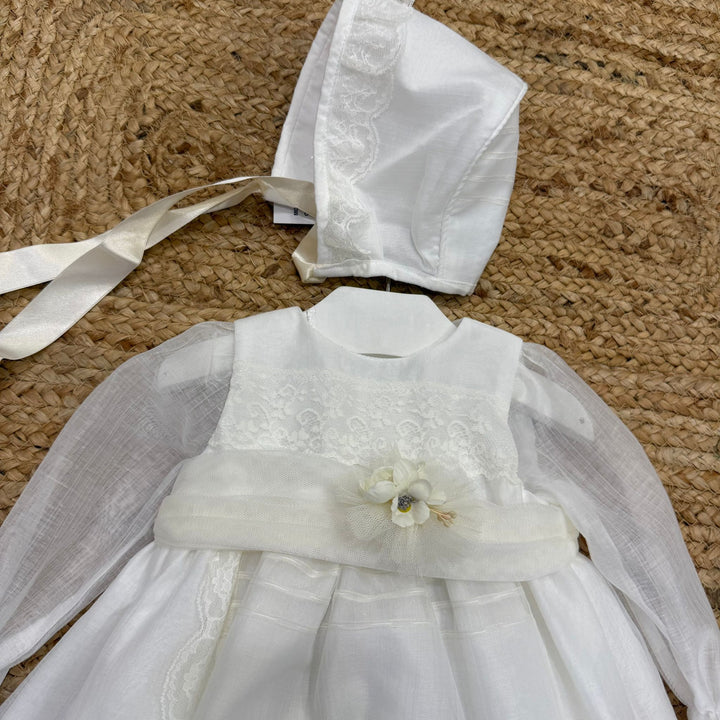 Questo abito elegantissimo per battesimo è realizzato in tessuto pregiato, impreziosito da delicati ricami e una manica velata che aggiunge un tocco di raffinatezza. La fascia in vita con fiocco in tulle e fiore sul davanti dona un’eleganza discreta e armoniosa. Completo di culotte coordinata e cuffia a tema, offre un look impeccabile per celebrare con stile e comfort.