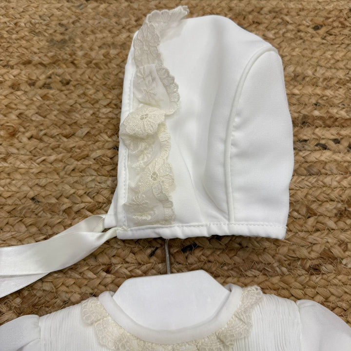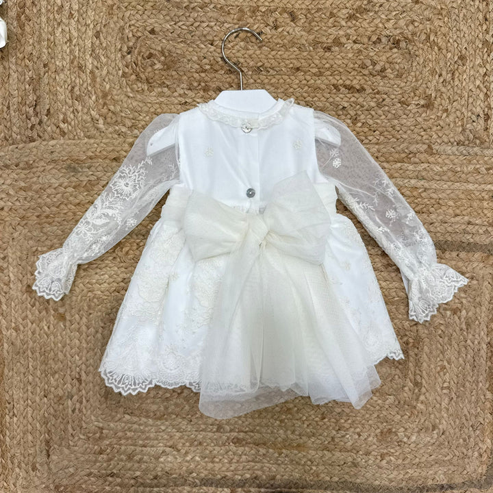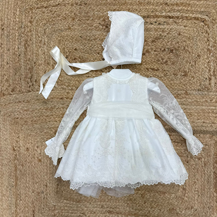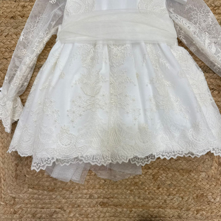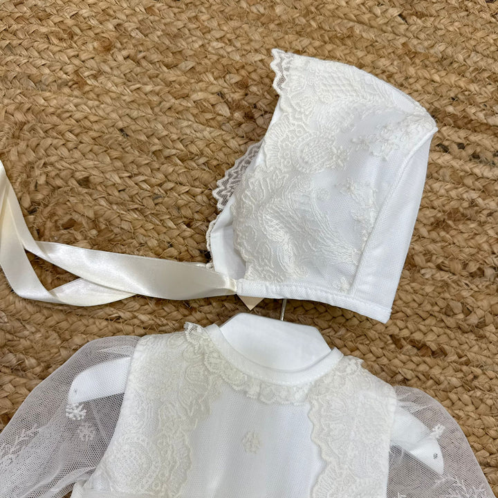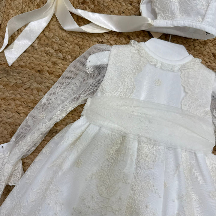Questo abito elegantissimo per battesimo è realizzato in tessuto pregiato, impreziosito da delicati ricami e una manica velata con ricami che aggiunge un tocco di raffinatezza. La fascia in vita con fiocco in tulle dona un’eleganza discreta e armoniosa. Completo di culotte coordinata e cuffia a tema, offre un look impeccabile per celebrare con stile e comfort.