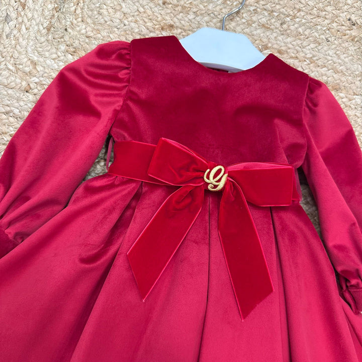 Questo abito elegante in velluto a manica lunga combina raffinatezza e comfort. La cinturina con fiocco aggiunge un dettaglio femminile, mentre la lettera "G" ricamata in oro dona un tocco di esclusività e classe al capo. Perfetto per occasioni formali, questo vestito valorizza la silhouette con eleganza sofisticata.
