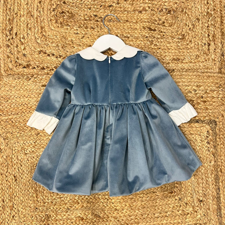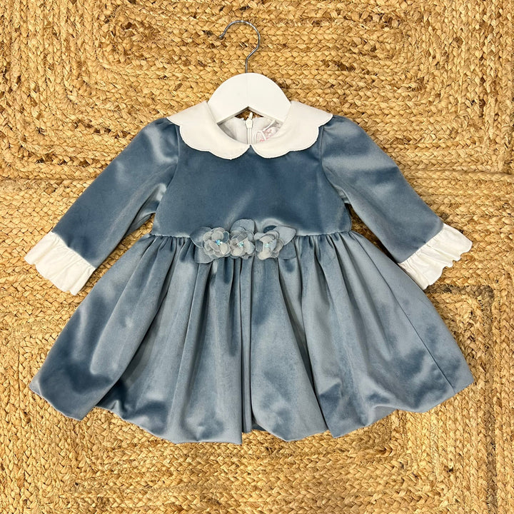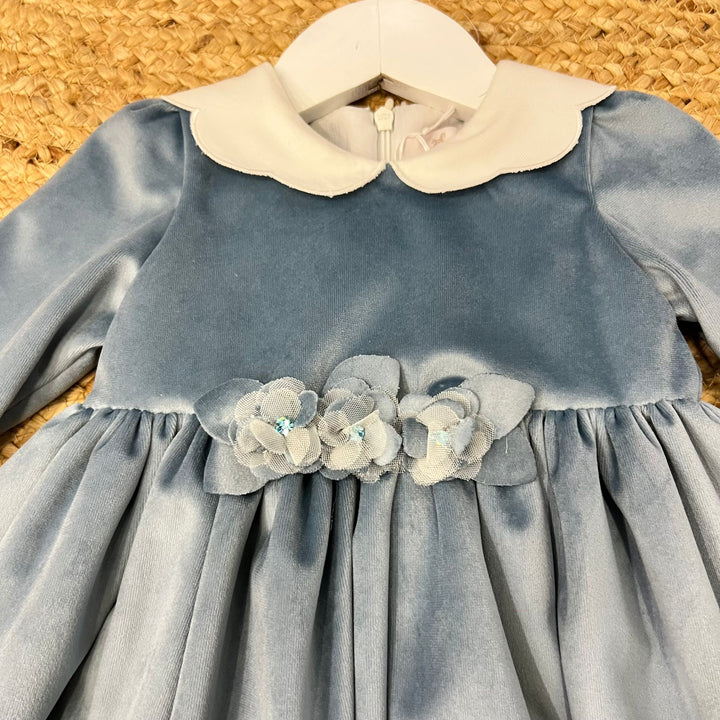 Questo abito elegante per neonata, firmato dall’azienda italiana Ambarabà, unisce stile e raffinatezza. Realizzato in velluto morbido e piacevole al tatto, presenta una delicata tonalità pastello celestino con collo e maniche bianche per un contrasto elegante. Il dettaglio del fiore applicato sul davanti aggiunge un tocco autentico di charme, perfetto per occasioni speciali mantenendo comodità e praticità.