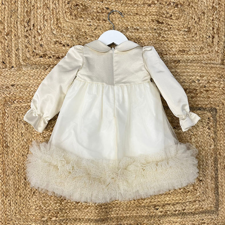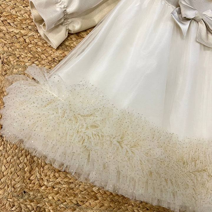 Questo abito elegante per neonata, firmato dall’azienda italiana Ambarabà, unisce stile e raffinatezza. Realizzato in tessuto lucido con dettagli glitterati sotto, garantisce un look scintillante e delicato. La manica lunga lo rende adatto alle occasioni speciali di stagione, mentre il fiocco frontale aggiunge un tocco di dolcezza e charme. Perfetto per vestire le più piccole con eleganza e comfort italiani.