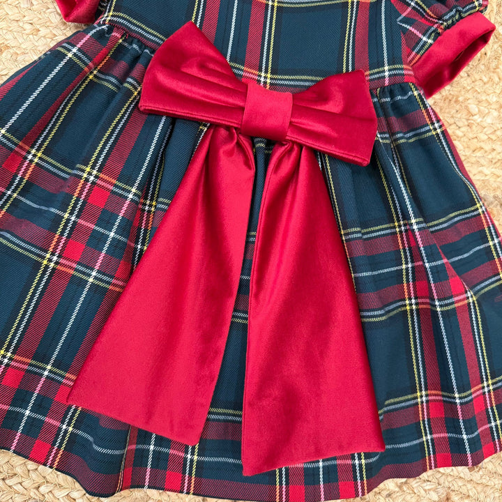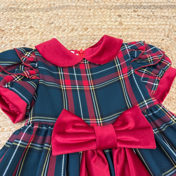 Questo abito elegante per neonati e bambine combina un raffinato tessuto tartan con dettagli in velluto sul collo e sulle maniche, creando un look sofisticato e delicato. Il grande fiocco in velluto sul davanti aggiunge un tocco distintivo e prezioso, mentre la cerniera a scomparsa sul retro assicura una vestibilità comoda e pulita. Perfetto per occasioni speciali, questo capo unisce stile e comfort con cura artigianale.