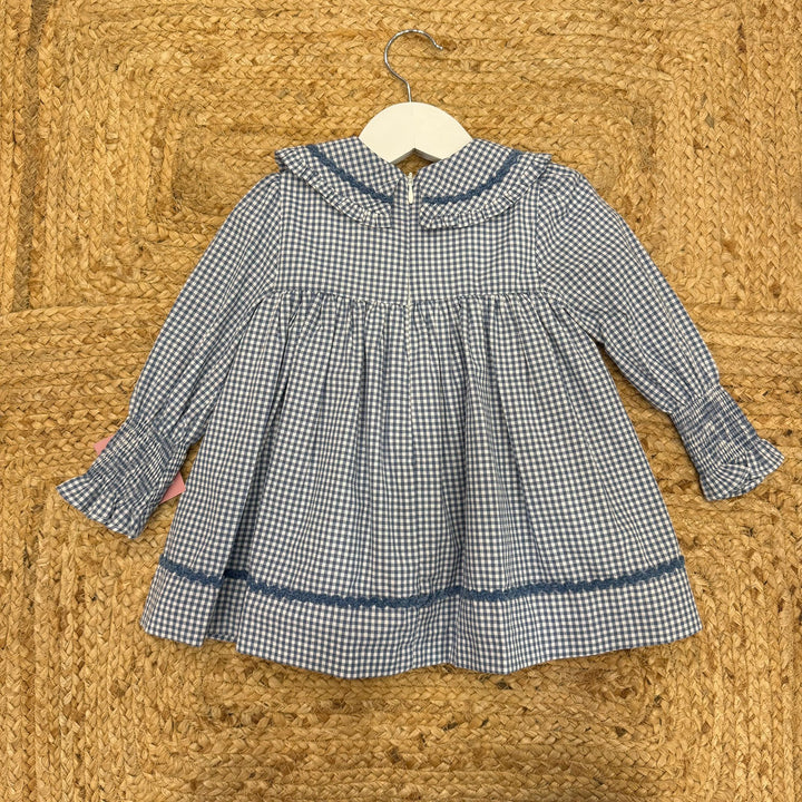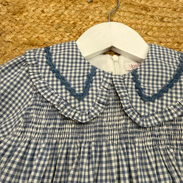 Questo abito elegante per neonata e bambina, realizzato da un'azienda spagnola, unisce raffinatezza e comfort. Il tessuto vichy, noto per la sua leggerezza e traspirabilità, è arricchito da un ampio collo che dona un tocco di classe. Il delicato ricamo in velluto aggiunge profondità e sofisticatezza, rendendo il capo ideale per occasioni speciali con stile impeccabile.