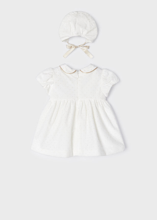 Vestito manica corta per neonato. Apertura posteriore con cerniera invisibile. Elementi decorativi: fiocco . Cuffia per neonato, perfetta come accessorio per completare il look.