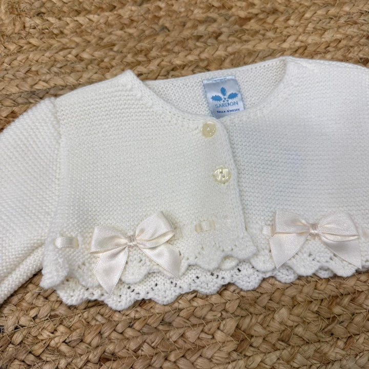 Cardigan con fiocchi in raso dell'azienda portoghese Sardon.