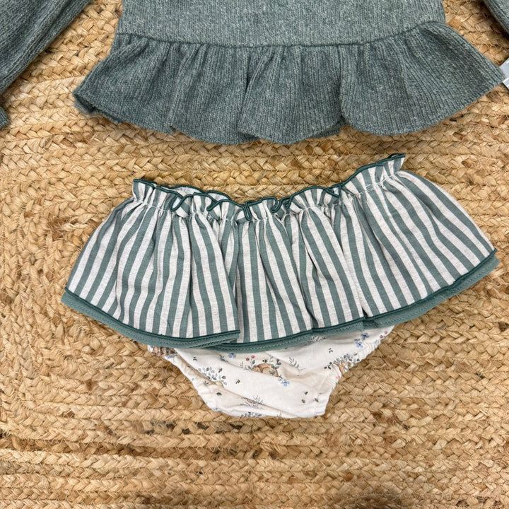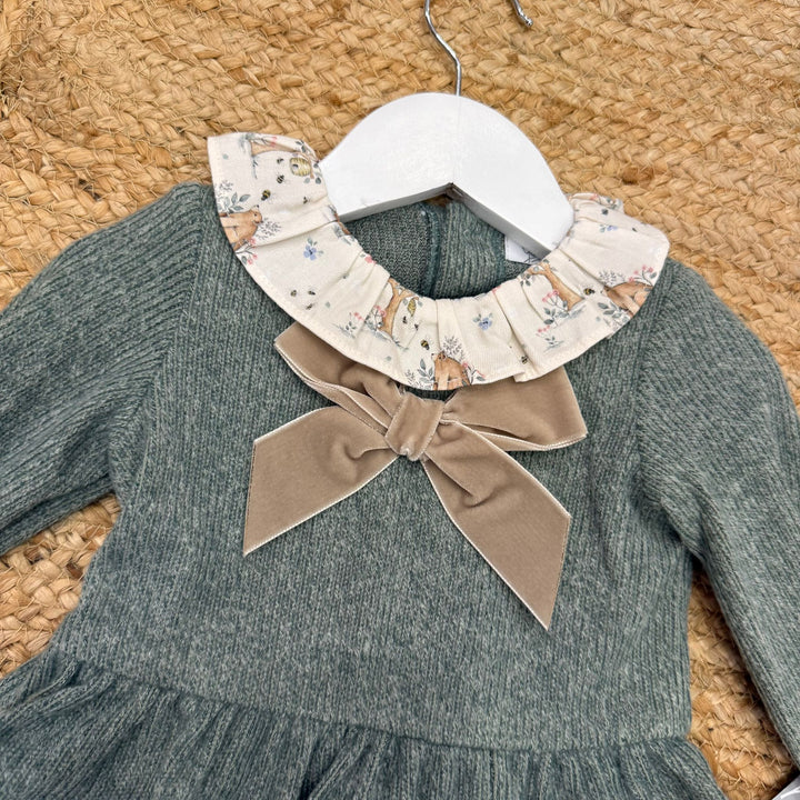 Questo elegante completo due pezzi per neonata include un maglione verde con collo ampio decorato da una stampa raffinata e un fiocco in velluto, abbinato a una culotte stampata con delicate balze rigate. Perfetto per garantire comfort e uno stile sofisticato in ogni occasione speciale.