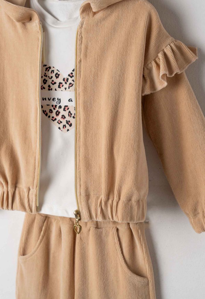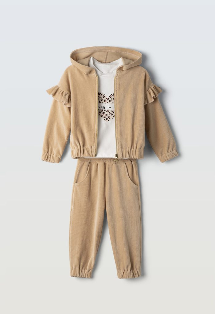 Questo completo 3 pezzi da bambina in velluto combina stile e comfort con una maglietta stampata, una felpa con cappuccio e un capo coordinato. Il tessuto in velluto offre una morbidezza superiore e calore ideale per i mesi più freschi, mentre il design versatile garantisce praticità e un look curato in ogni occasione. Perfetto per chi cerca un outfit comodo senza rinunciare a un tocco di eleganza.