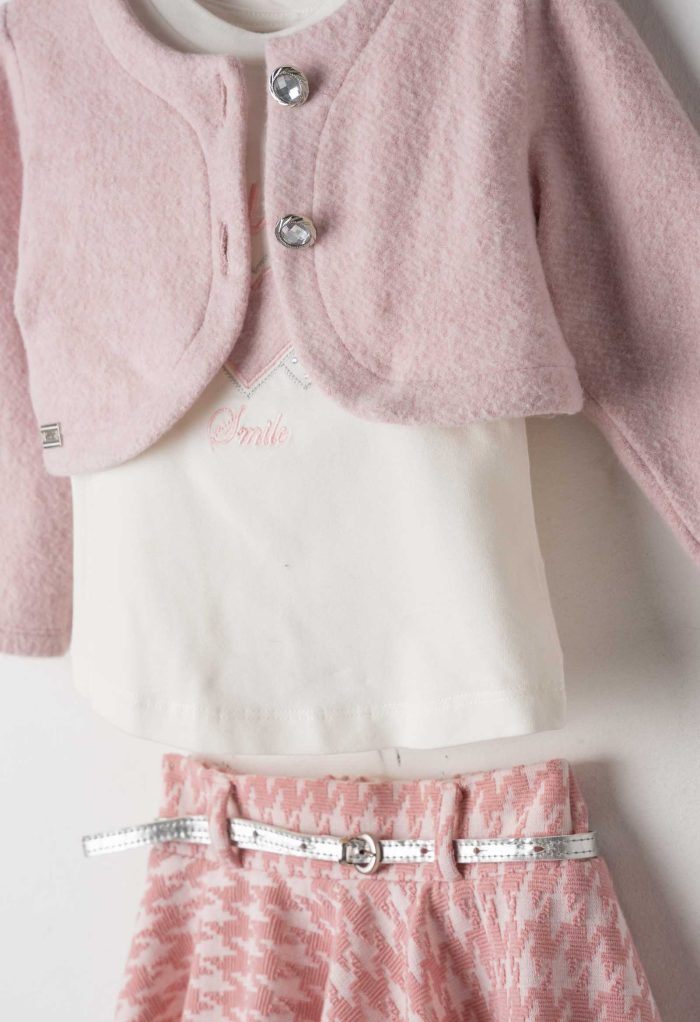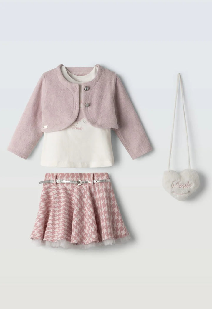Questo completo da bambina elegante include tutto il necessario per un look raffinato: una gonna con cintura, una maglia abbinata, un cardigan coordinato e una pratica borsetta. Perfetto per occasioni speciali, questo set garantisce comfort e stile in ogni momento.