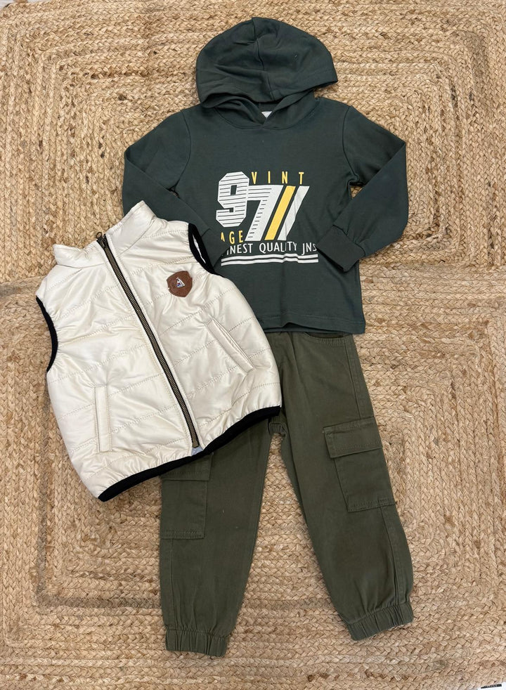 Questo completo sportivo da bambino è composto da tre pezzi essenziali: pantalone cargo, maglia con cappuccio e giubbino smanicato. Progettato per offrire comfort e praticità, il pantalone cargo garantisce ampi spazi per riporre piccoli oggetti, mentre la maglia con cappuccio assicura protezione e stile. Il giubbino smanicato aggiunge uno strato extra di calore senza limitare i movimenti, ideale per le attività all’aperto. Una soluzione versatile e funzionale per i più giovani, adatta sia al tempo libero che allo sport.