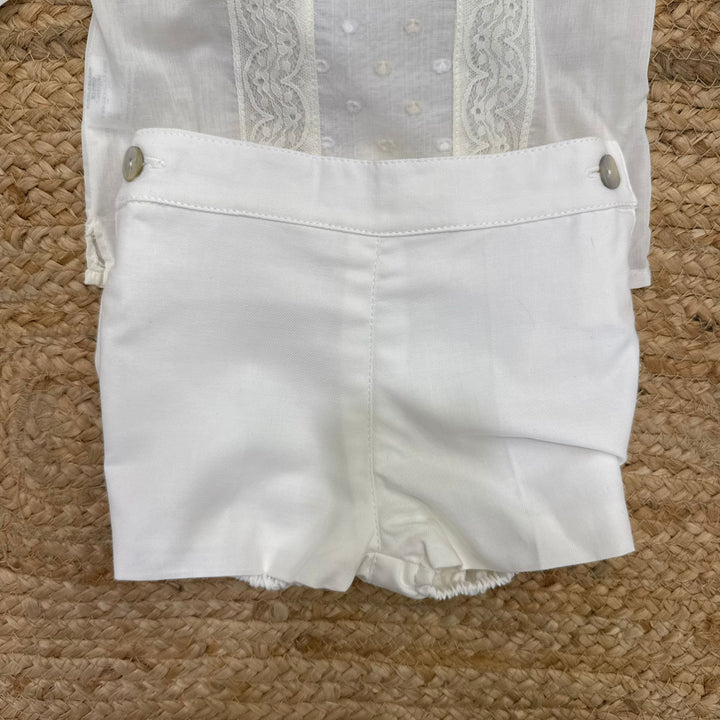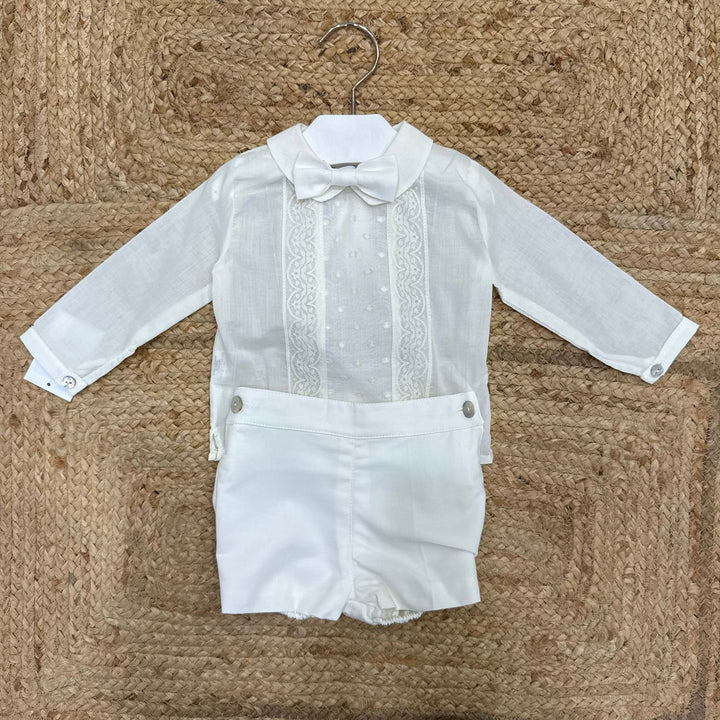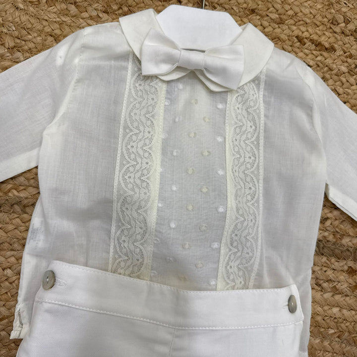 Questo completo battesimale in tonalità bianco panna offre un’eleganza raffinata, perfetta per un’occasione speciale. La camicia è accompagnata da un delicato rimaco e un papillon incluso, che aggiungono un tocco di classe. I dettagli come i bottoni in madreperla sul bermuda completano il look con sofisticatezza. Ideale per celebrare momenti unici con stile e delicatezza.
