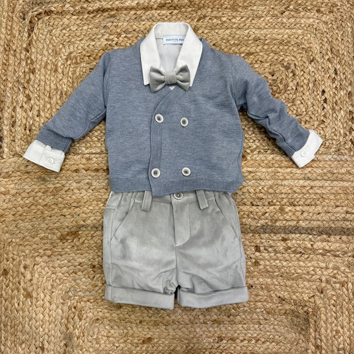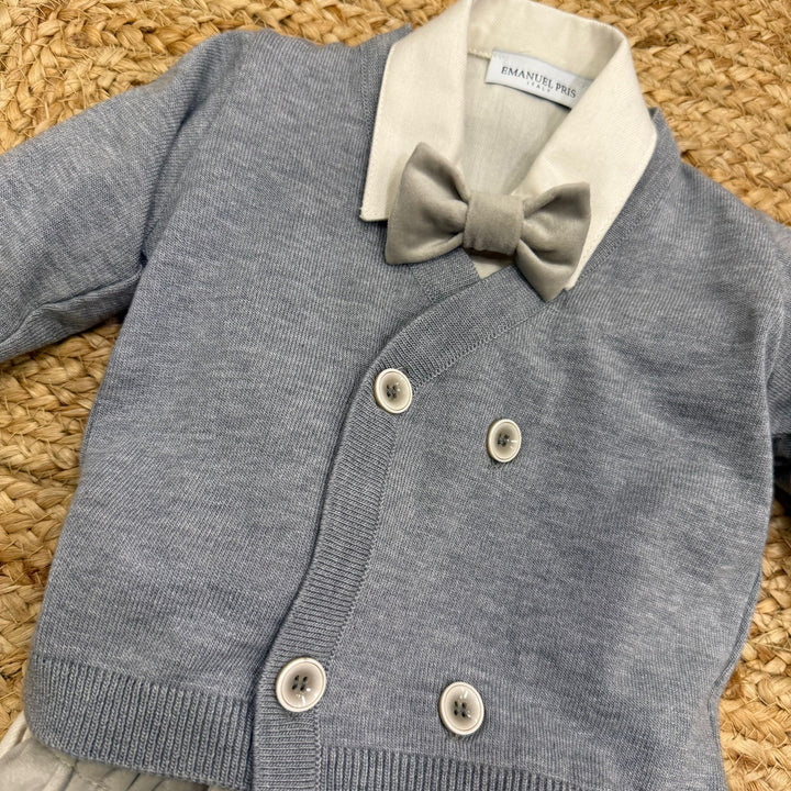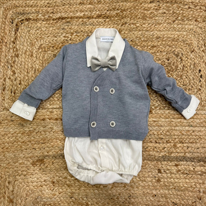 Questo completo elegante in velluto di Emanuel Prisc è composto da salopette, camicia body, papillon in tessuto coordinato e giacchino. Perfetto per chi cerca un look raffinato e armonioso, ogni elemento è studiato per garantire comfort e stile, rendendo questo outfit ideale per occasioni formali e di classe.