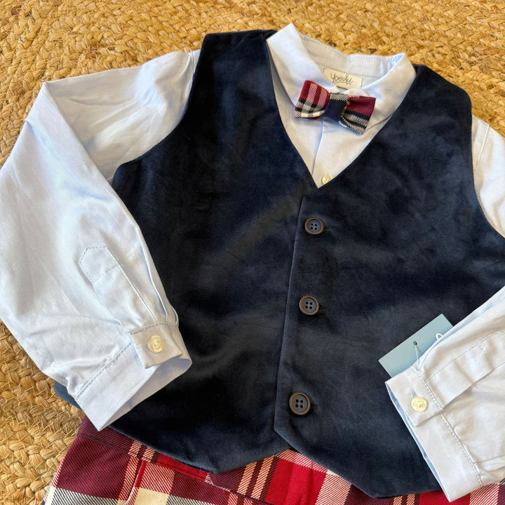 Per il tuo bambino elegante, opta per il meraviglioso completo della moda spagnola. Il pantaloncino a tartan in combo con papillon, la camicia celeste e il panciotto in velluto creano un look perfetto per le feste di Natale. Stile e comfort garantiti!